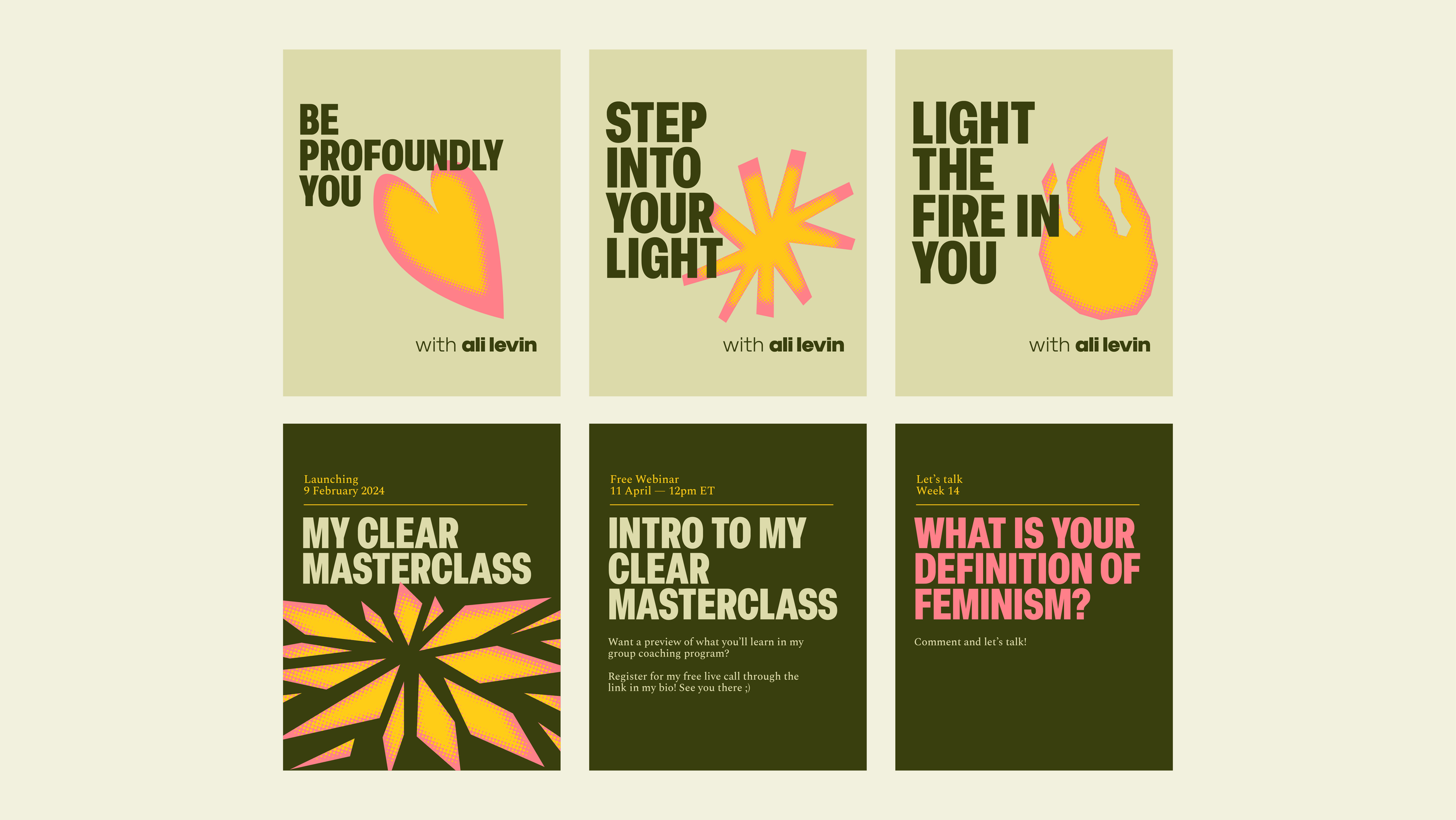 We also designed a set of vibrating icons that add a sense of boldness and authenticity to her brand, reflecting her approach. They enhance messaging by adding character to designs and providing context about both the messaging and who Ali is.